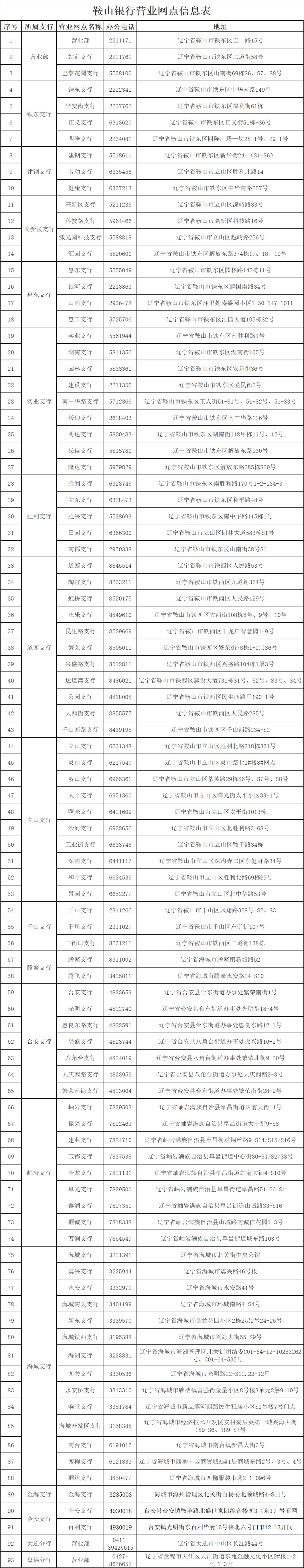 | 2 | 鞍山银行科技路支行 | 0412-5964466 | 辽宁省鞍山市高新区科技路16号 |