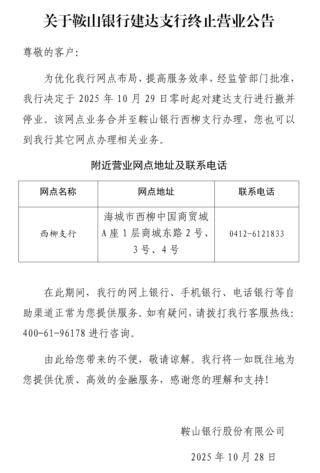 当前位置:首页 > 最新公告 >关于鞍山银行建达支行终止营业公告