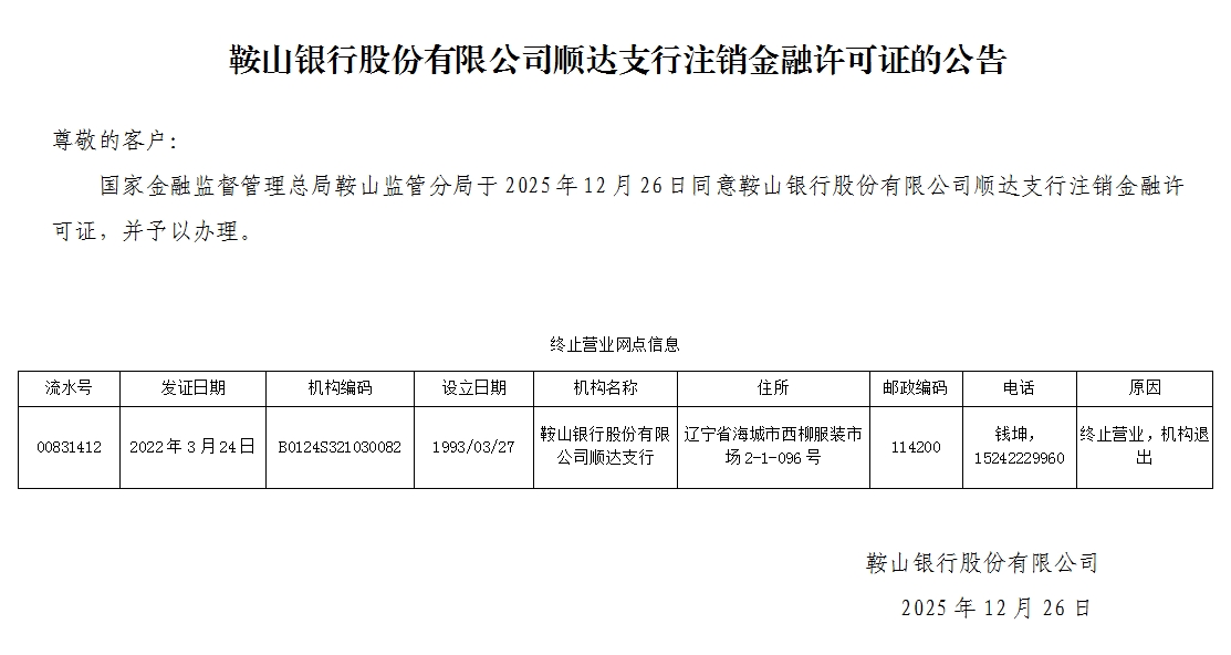 鞍山银行股份有限公司顺达支行注销金融许可证的公告